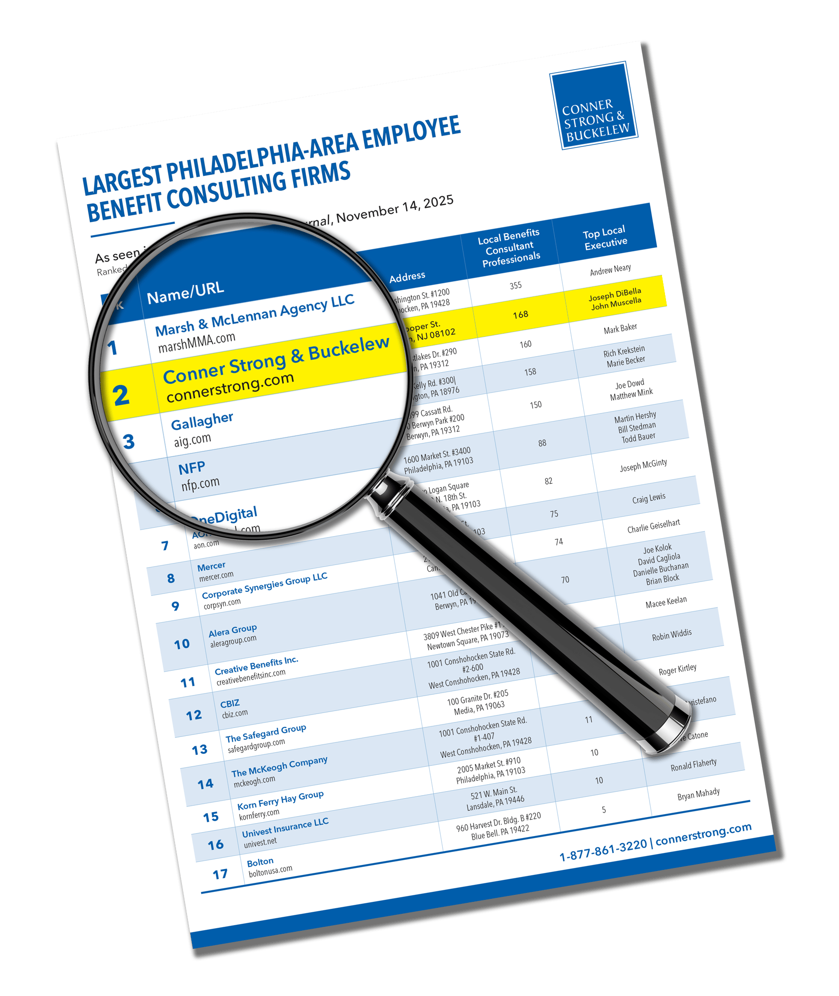Philadelphia Business Journal has ranked Conner Strong & Buckelew the second largest employee benefits consulting firm in the Greater Philadelphia area.